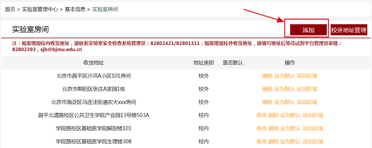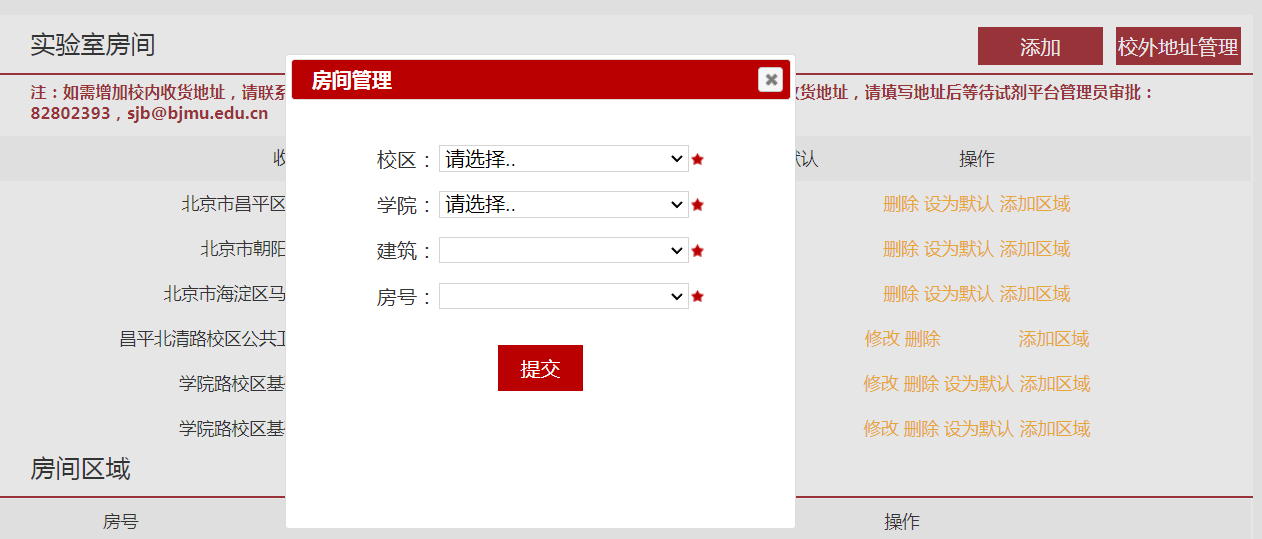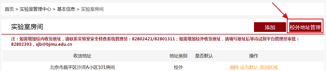试剂平台实验室房间模块上线后,原有校外地址均已删除。新增医学部校外地址(非医学部校区建筑),可以自行填写并由试剂平台系统管理员审核(82802393/sjb@bjmu.edu.cn),审核通过后即可选择使用。